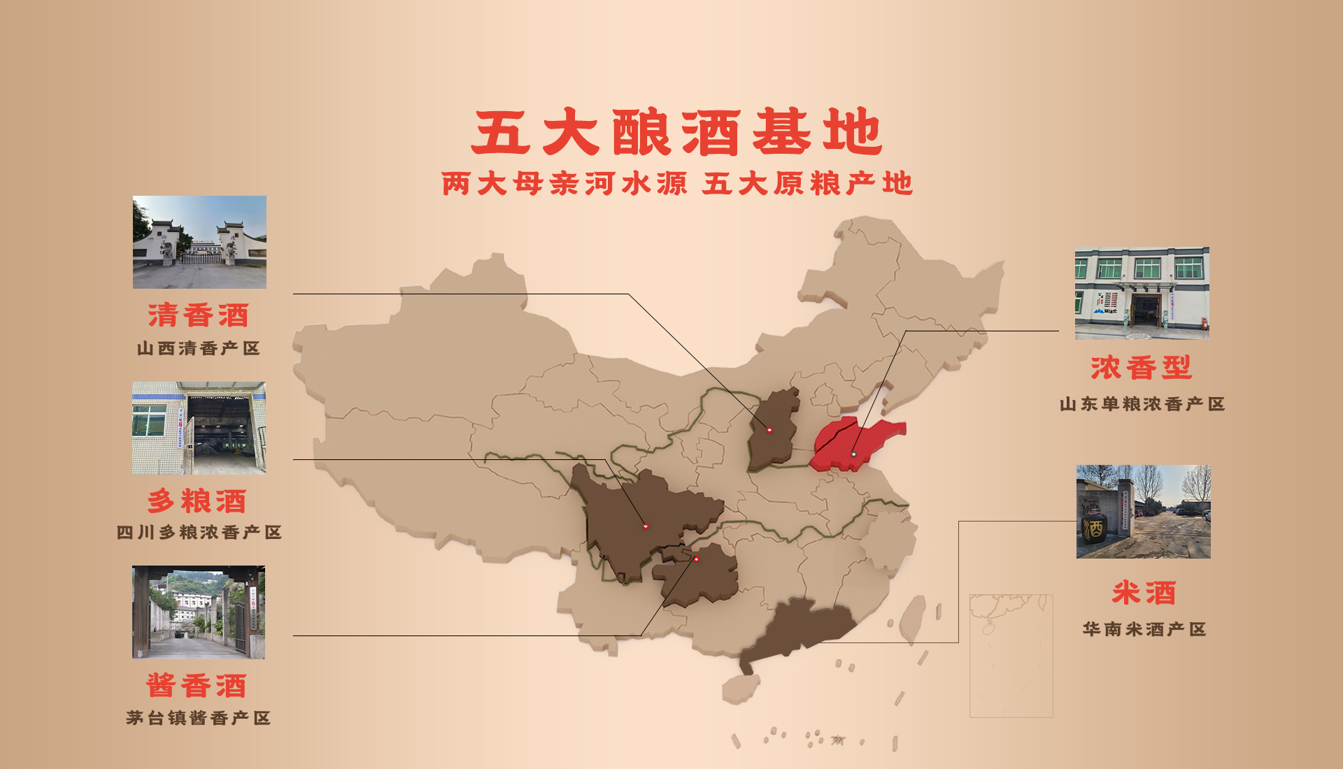 千古一镇深耕中高端市场,在全国有五大酿酒基地(坤沙酱酒酿酒基地在贵州茅台镇酱香产区、多粮酒酿酒基地在四川多粮浓香产区、清香型酿酒基地在山西清香产区、浓香型酿酒基地在山东单粮浓香产区、米酒酿酒基地在华南米酒产区)专注于古镇白酒古法酿造技艺的传承与体验,打造更具信赖的高品质原酿生态集群国民用酒。